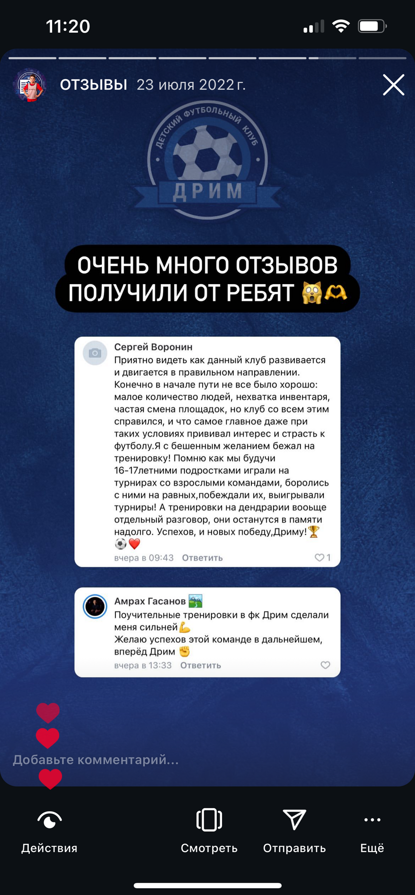 Детский футбольный клуб Дрим – это школа, где ценится индивидуальный подход к каждому ребенку. Мы предлагаем профессиональную тренировочную программу, развиваем не только физические, но и технические и тактические умения. С детьми работают настоящие профессионалы своего дела. В команде держится атмосфера дружбы и взаимного уважения.